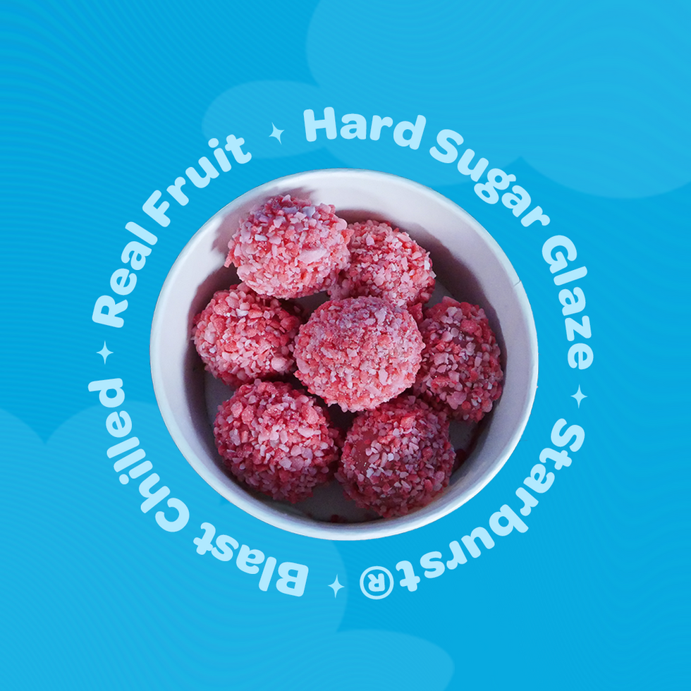 Your choice of fruit dipped in our signature hard sugar glaze and rolled in FaveREDs Starburst® candy pieces.